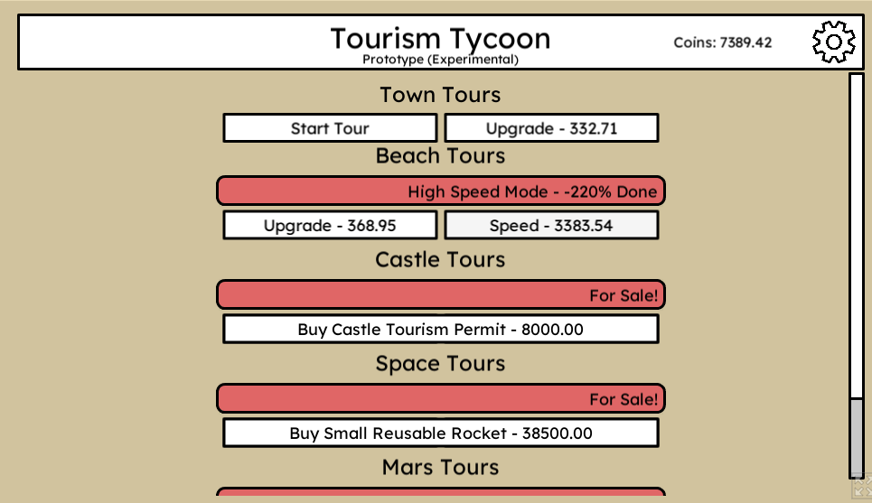I like your game, feels like Adventure Capitalist, but 1 suggestion is that the slider can be improve, as when i press the speed to a certain point, the slider will start to move really fast, maybe when it reaches a certain time, just have it play a simple animation, the player will not really care when it hit 0%, since money is increasing every second from then on. rest of the game is understandable and simple to play. also if possible, add more effects to the game, like give the buttons more color when highlighted.